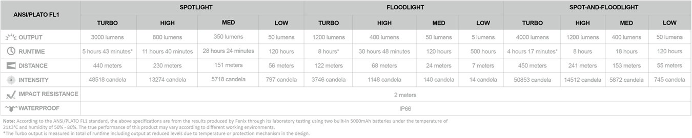 Lichtquelle: Eine XHP70 LED (neutralweiß) und zwei SST20 LEDs (warmweiß), jeweils mit einer Lebensdauer von 50.000 Stunden.